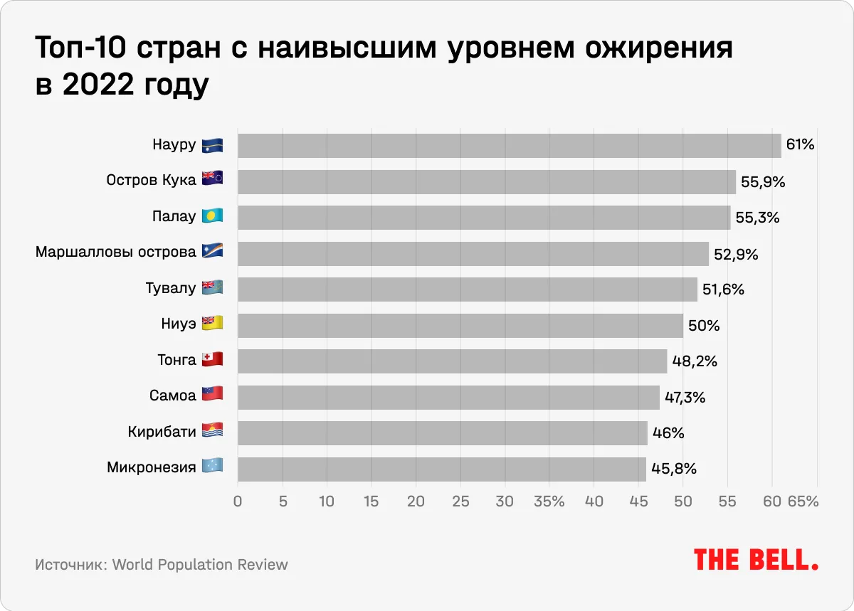 По данным Всемирной организации здравоохранения (ВОЗ), во всем мире более 2,6 млрд человек, то есть почти 33% населения Земли, живут с лишним весом, а ожирением страдают около 892 млн. К последней категории относятся люди с индексом массы тела (ИМТ) выше или равным 30, а избыточной массой тела считается ИМТ ≥ 25. Во Всемирной федерации по борьбе с ожирением (World Obesity Federation, или WOF) прогнозируют, что к 2035 году эти показатели существенно вырастут.