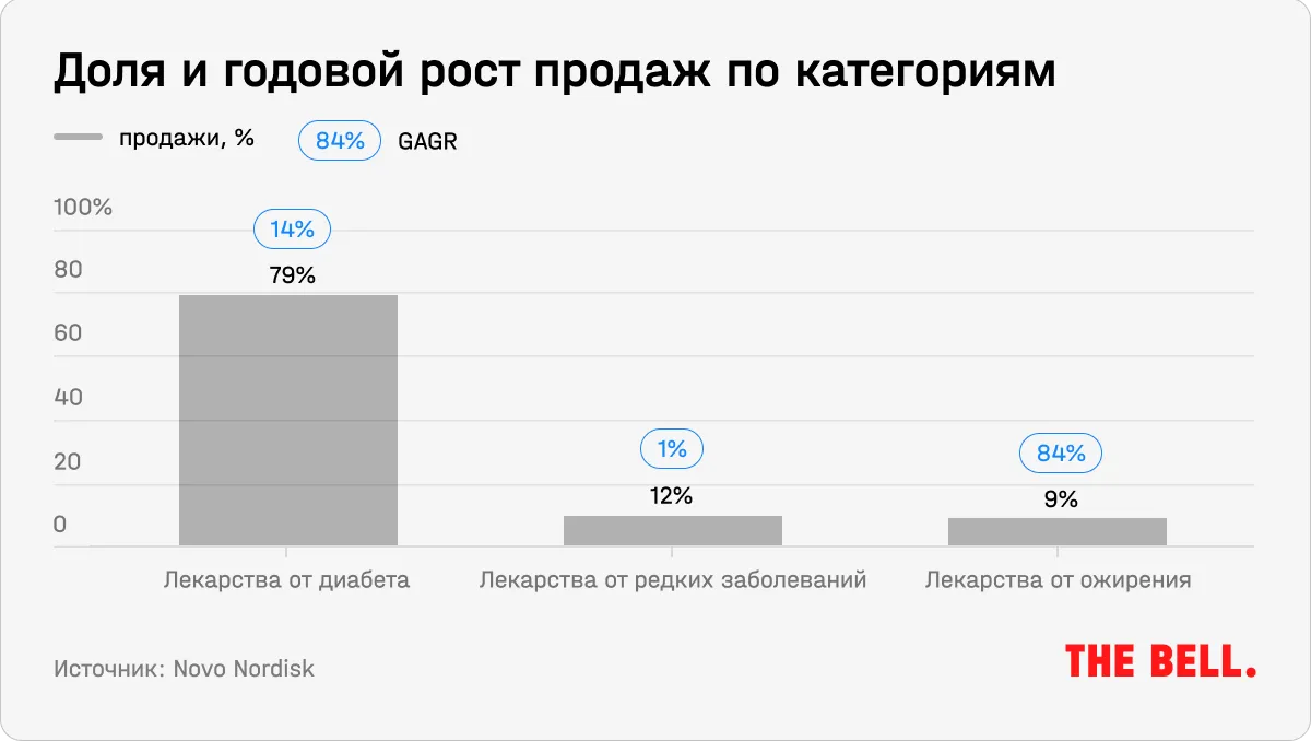 Компания первой выпустила на рынок инъекции от ожирения нового поколения и остается лидером этого быстрорастущего рынка с долей в 94%. Продажи средств от ожирения растут с 2018 года, а в 2022 году выручка этого сегмента выросла на 84%, до 16,9 млрд датских крон ($2,3 млрд). Это 9% от общего объема продаж компании. К 2025 году компания планирует увеличить этот показатель до $3,5 млрд.