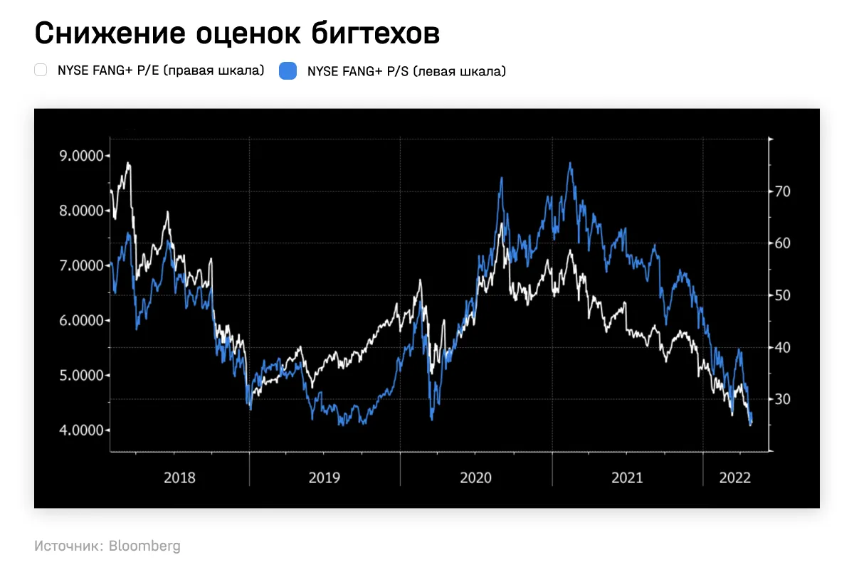 Завышенные за время пандемии оценки акций — начинают схлопываться: Price to Earnings (P/E) и Price to Sales (P/S) компаний из индекса NYSE FANG+ вернулись к доковидным уровням. Этот индекс включает пять самых крупных компаний на Нью-Йоркской бирже — Meta, Apple, Amazon, Netflix и Alphabet, а также пять активно торгующихся на бирже технологических компаний, включая Alibaba, Baidu, NVIDIA, Tesla и Twitter.