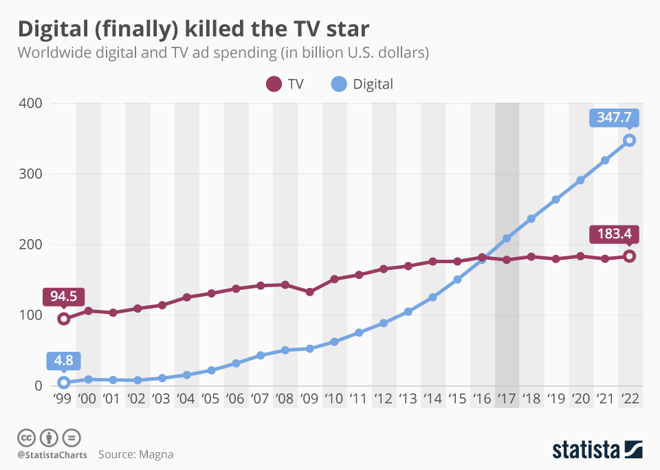 2017-й уже наверняка станет годом официальной победы интернет-рекламы. Еще в марте главные прогнозисты мирового рынка из агентства ZenithOptimedia предсказали, что на онлайн-рекламу в этом году впервые в истории потратят больше, чем на телевизионную. Последняя оценка агентства Magna подтверждает, что это уже случилось, а в 2022 году в интернете уже будет потрачено вдвое больше.
