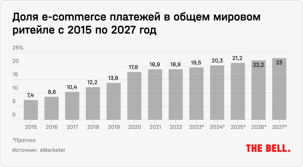 Бум электронной коммерции, вероятно, позади, а период роста сменился стагнацией и ужесточением конкуренции, пишет The Economist. В 2020-м во время пандемии доля e-commerce в общем объеме мирового ритейла, согласно исследованию eMarketer, выросла сразу на 4 процентных пункта. Необходимость переводить значительную часть расходов в онлайн заставила ритейлеров развивать сегмент доставки и убедила инвесторов, что и после пандемии люди продолжат совершать покупки в интернете — это разогнало акции e-commerce компаний до исторических пиков.