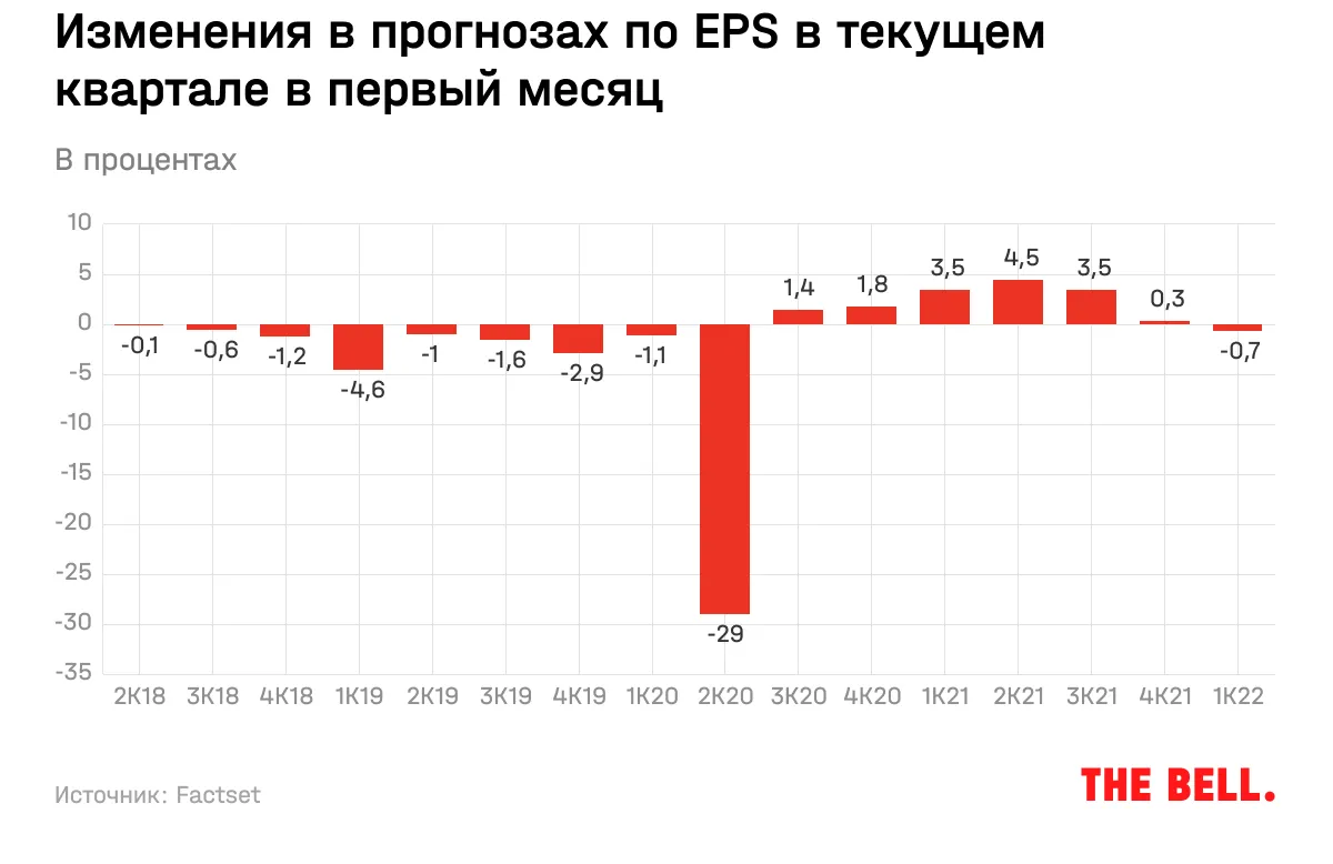 После четырех кварталов подряд, когда прогнозы по прибылям на акцию торгующихся в США компаний почти неизменно только росли, оптимизм аналитиков инвестбанков стал куда более умеренным. Несмотря на хорошие результаты в прошлом квартале, оценки прибылей на текущий — уменьшились впервые с середины 2020 года, когда мир был охвачен пандемией (данные Factset).
