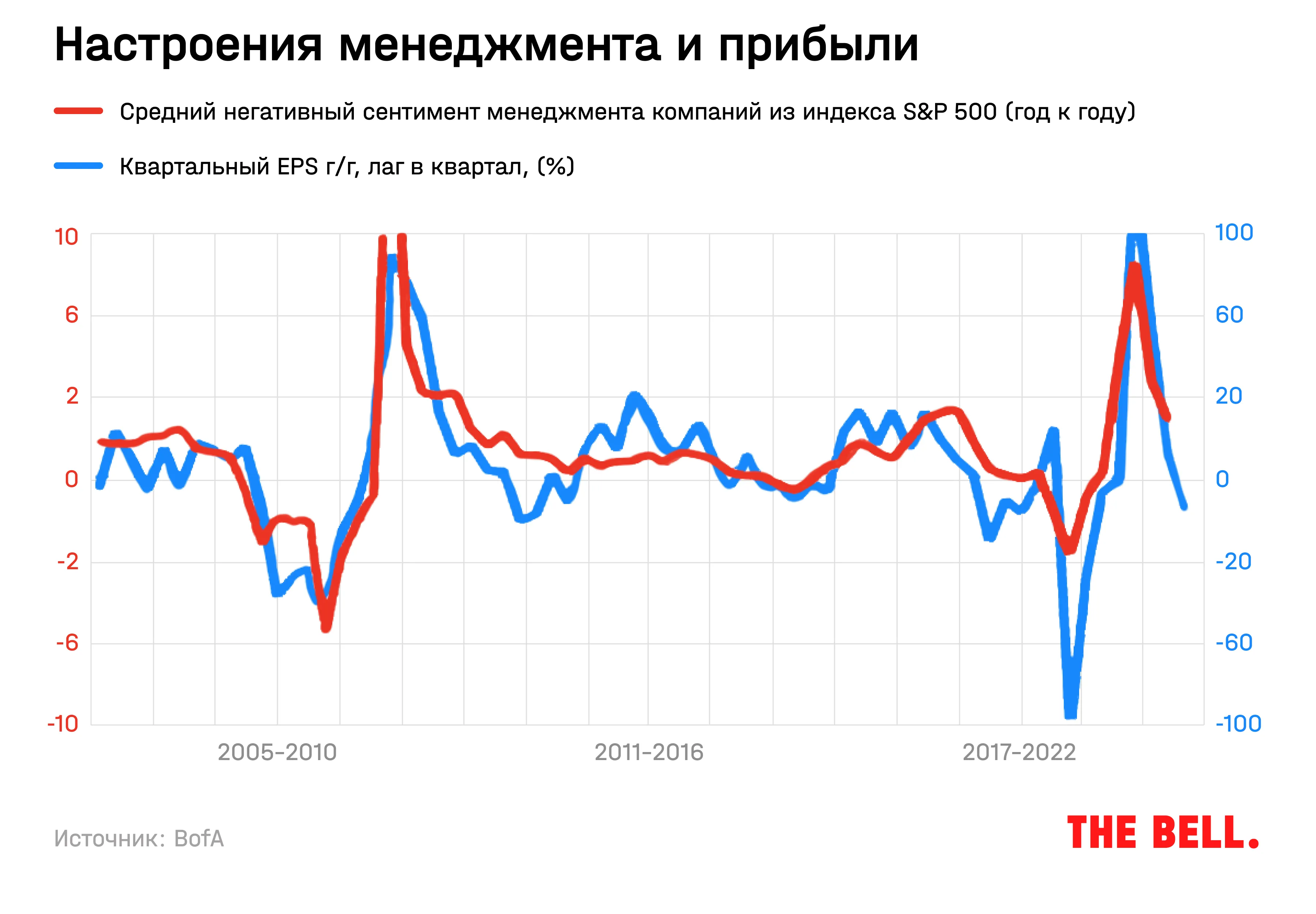 Прогнозы самих компаний насчет своего будущего звучат все менее уверенно, приводит WSJ слова одного из аналитиков: 34 компании, в том числе Meta, представили прогнозы хуже ожиданий аналитиков, и только 13 — выше. Анализ, проведенный BofA на основе обработки текстов на естественном языке (Natural Language Processing), также показывает, что негативные настроения менеджмента нарастают. В последние годы это было хорошим опережающим индикатором прибылей компаний (коэффициент корреляции — 53%).