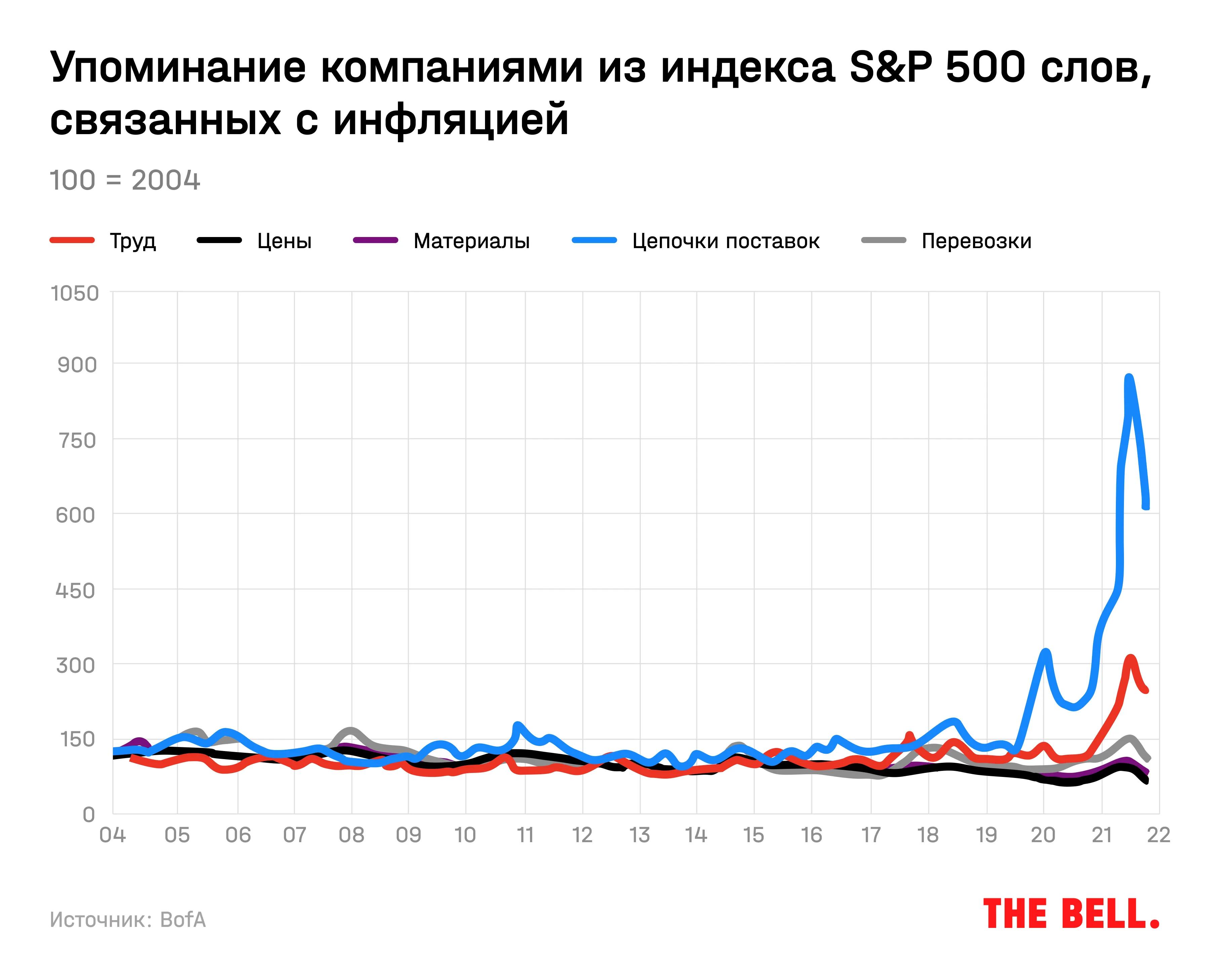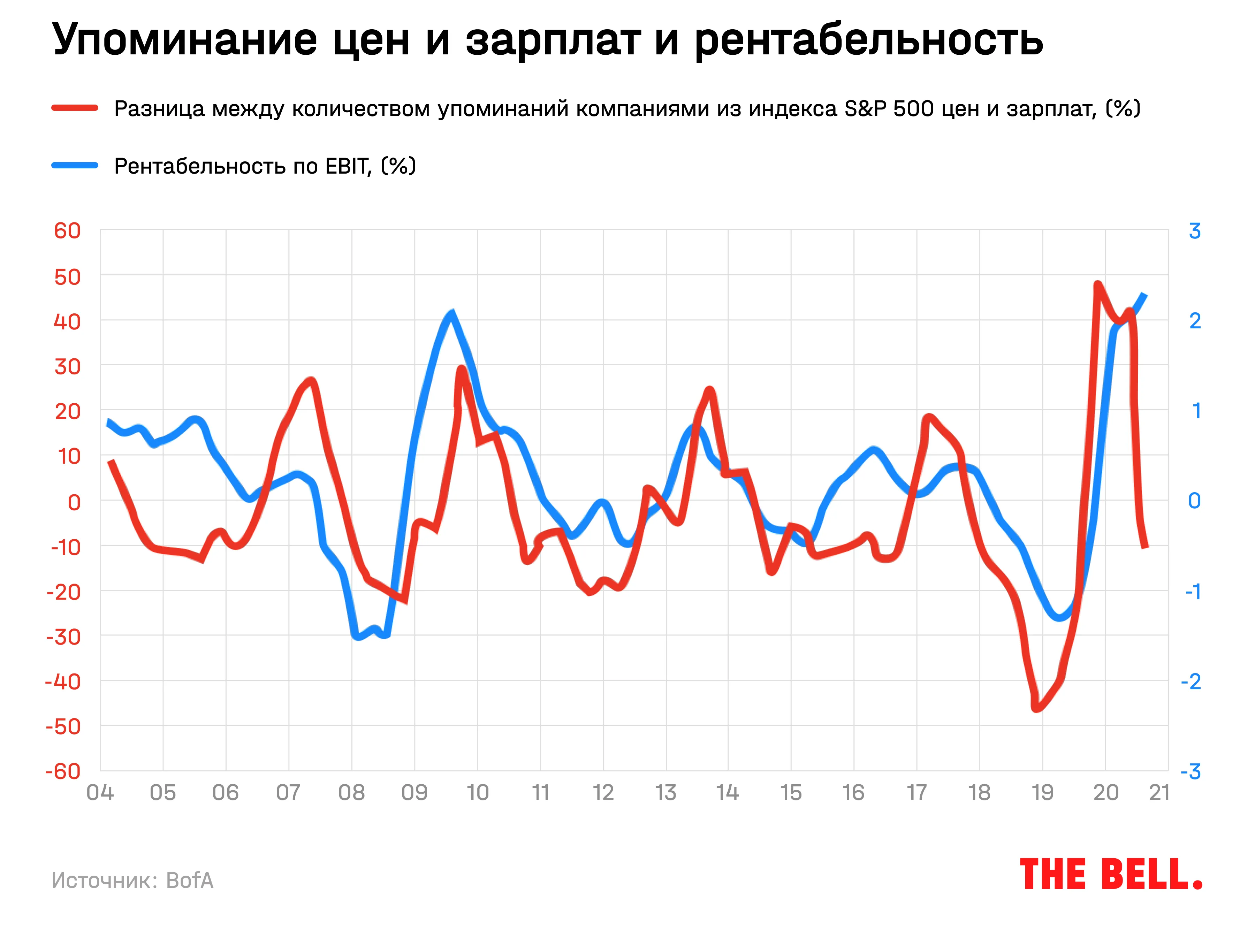 Перебои с цепочками поставок по-прежнему остаются главным источником беспокойства компаний. Упоминание возможного роста цен на свою продукцию уже не превышает упоминания риска роста зарплат. Это может быть плохим знаком для рентабельности (коэффициент корреляции между двумя показателями также составляет 53%), за которой пристально следят инвесторы.
