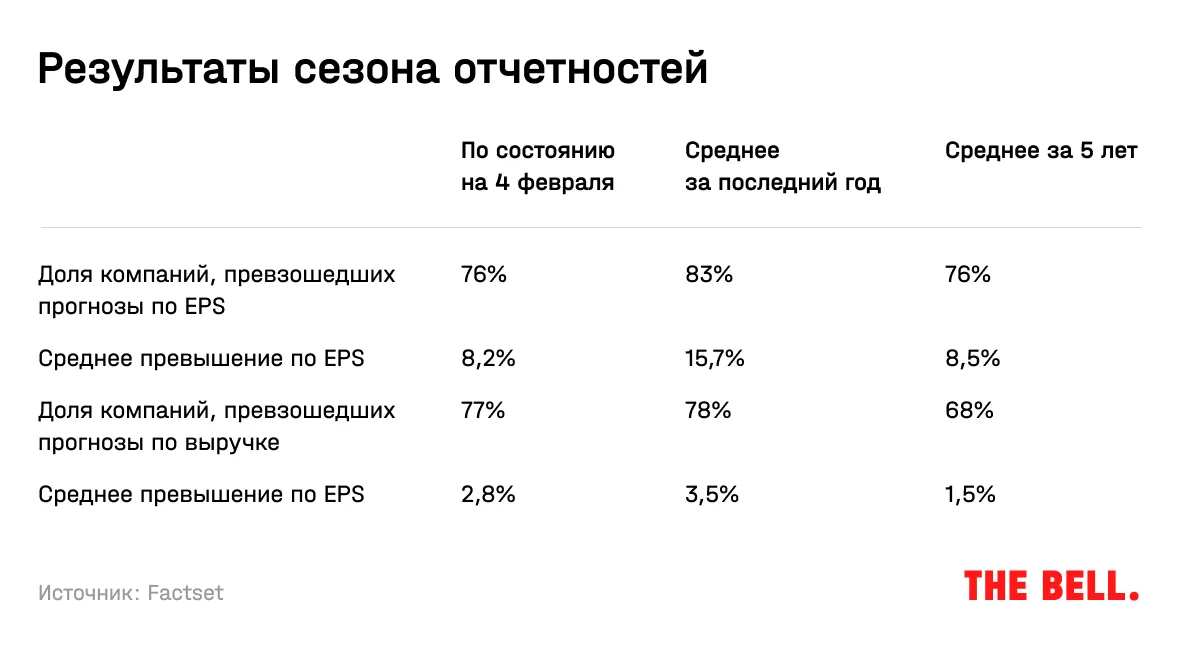 К концу прошлой недели, по данным Bank of America, отчитались 276 компаний из индекса S&P 500, на которых приходится 75% прибылей. Один из выводов — если в прошлом году компаниям удавалось значительно превосходить ожидания рынка и это только разгоняло котировки, то теперь разрыв между фактическими результатами и прогнозами рынка сокращается, постепенно возвращаясь к средним значениям.