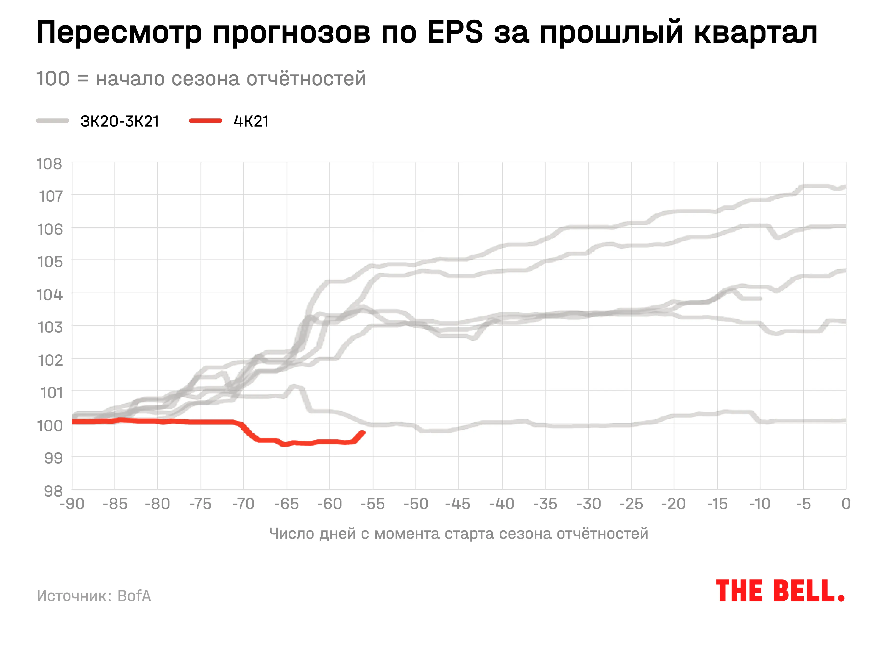 Как итог, на стоимость компаний все больше влияют не фактические результаты, а прогнозы на будущее. Компании, которые опередили прогнозы по выручке и прибыли, на следующий день после отчетности превосходили S&P 500 на 48 б.п. против исторически среднего в 150 б.п., следует из данных BofA. Тех, кто отчитался хуже прогноза, рынок на этот раз также наказал меньше (136 б.п. против средних 235 б.п.).