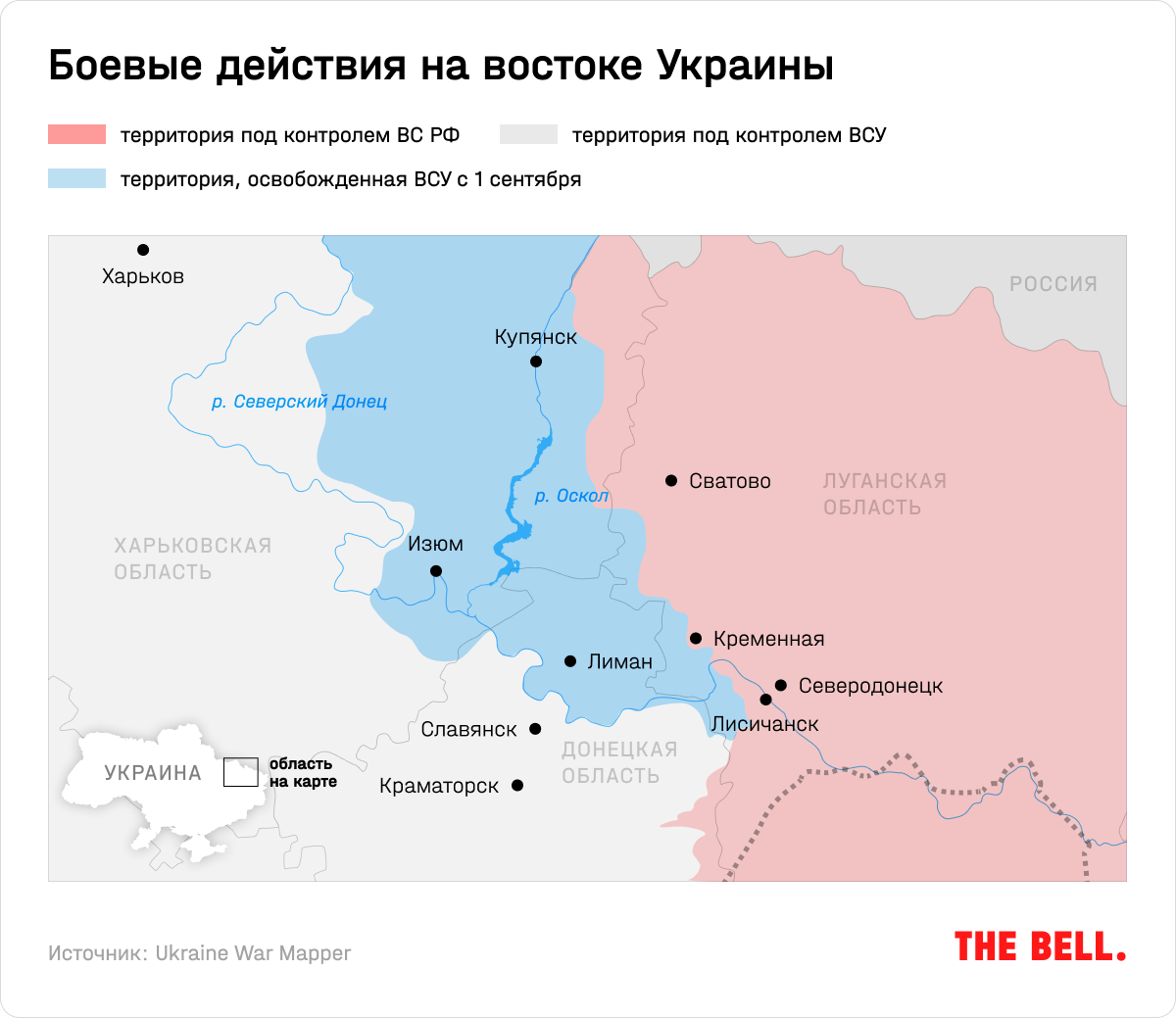 Пока российская армия продолжает страдать от нехватки личного состава на протяженном фронте, украинская — сохраняет инициативу и продолжает наступательные операции. Уже на следующий день после освобождения Лимана ВСУ перешли в наступление в Херсонской области. Всего за два дня украинцы смогли освободить около трети территории правобережья Днепра, занятой российскими войсками, отбив в том числе село Давыдов Брод, бои за которое шли с августа. Под угрозой окружения российские войска снова вовремя отошли, не дожидаясь попадания в котел.