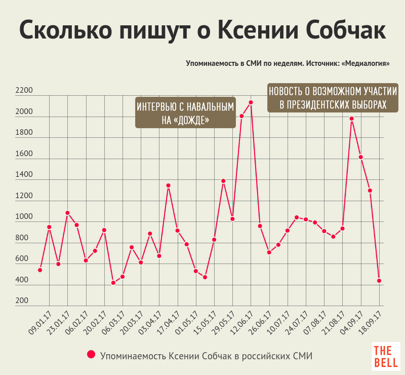 Если говорить о росте упоминаемости, то возможное участие Собчак в выборах – в любом качестве – уже принесло свои плоды. 1 сентября, когда «Ведомости» опубликовали статью с предположением о том, что Собчак может выдвинуться в президенты, ее упоминаемость в СМИ резко взлетела. Впрочем, летнее интервью с Навальным все равно дало больше.