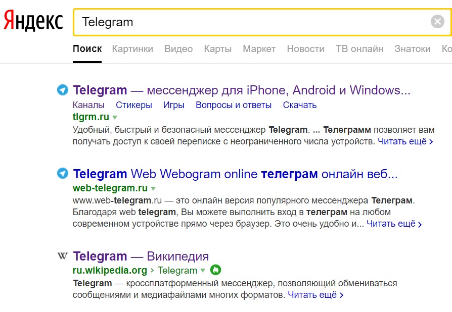- Но в поисковой выдаче «Яндекса» по запросу «Telegram» официальная страница не появляется.
