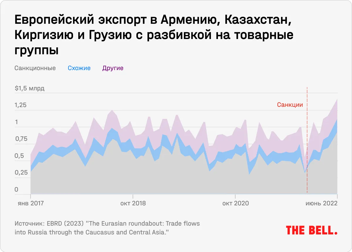 Тот факт, что соседние с Россией страны увеличили европейский импорт товаров, попавших под санкции, и аналогичные им, может говорить о том, что так Москва обходит ограничения со стороны ЕС, писали в февральском докладе экономисты Европейского банка реконструкции и развития, изучившие экспортные потоки из Армении, Казахстана, Киргизии и Грузии. Но даже то, что Россия поставляет из этих стран ЕАЭС, лишь на 5% покрывает потерю санкционных товаров, указывали авторы.