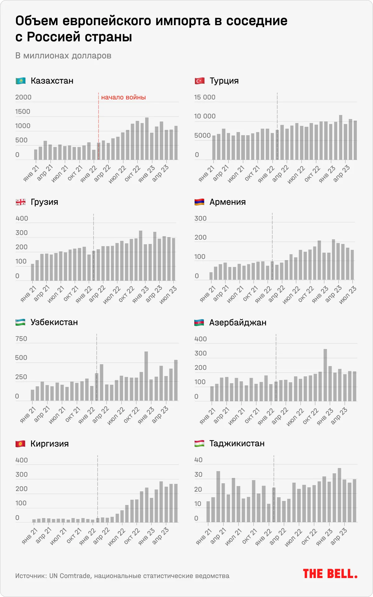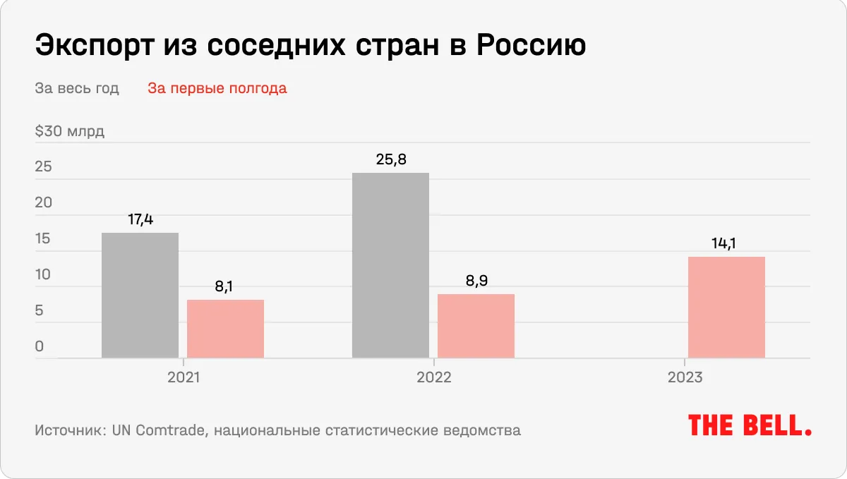 С начала войны Россия попала под беспрецедентные санкции. Но цифры доказывают, что страна нашла много лазеек для их обхода. За январь—июнь 2023 года Россия увеличила импорт из соседних стран как минимум на $5,2 млрд, или на 37%, подсчитал The Bell на основе их статистики. Сама Россия эти данные больше не раскрывает.
