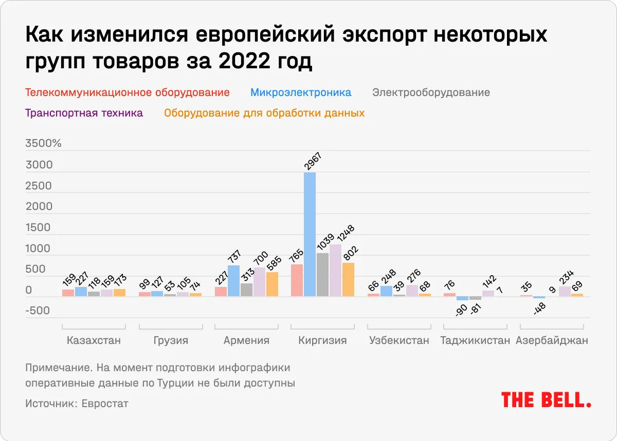 За 2022 год соседние с Россией страны существенно нарастили европейский импорт определенной группы товаров, говорится в отчетах Евростата. Среди них: телекоммуникационное оборудование, микроэлектроника, электрооборудование, транспортная техника, электронное оборудование для обработки данных (компьютеры, серверы, жесткие диски, смартфоны, компьютерная периферия).
