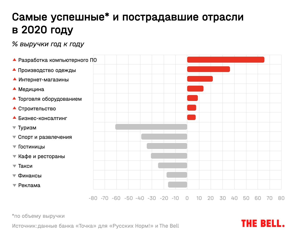Ровно год назад в эти дни Россия ушла на двухнедельный карантин, который в итоге затянулся на месяцы. Неизвестность порождала панику, бизнес ждал если не возвращения 1990-х, то как минимум нового 2008-го. Чтобы подвести итоги года пандемии для бизнеса, мы поговорили с предпринимателями из разных сфер (смотрите интервью в проекте «Русские норм!») и проанализировали цифры. Главный вывод: у ковида были и бенефициары, и многочисленные жертвы, а тех, у кого осталось «все по-прежнему», не осталось — но в целом бизнесу удалось отделаться малой кровью.