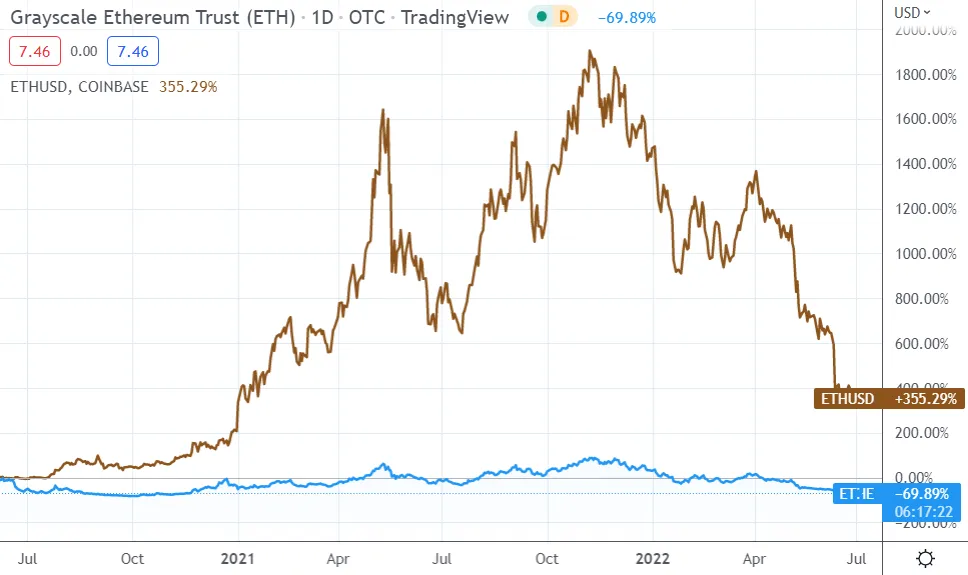 YCharts: Бычачья премия ETHE плавно перешла в 2022 году в медвежью скидку