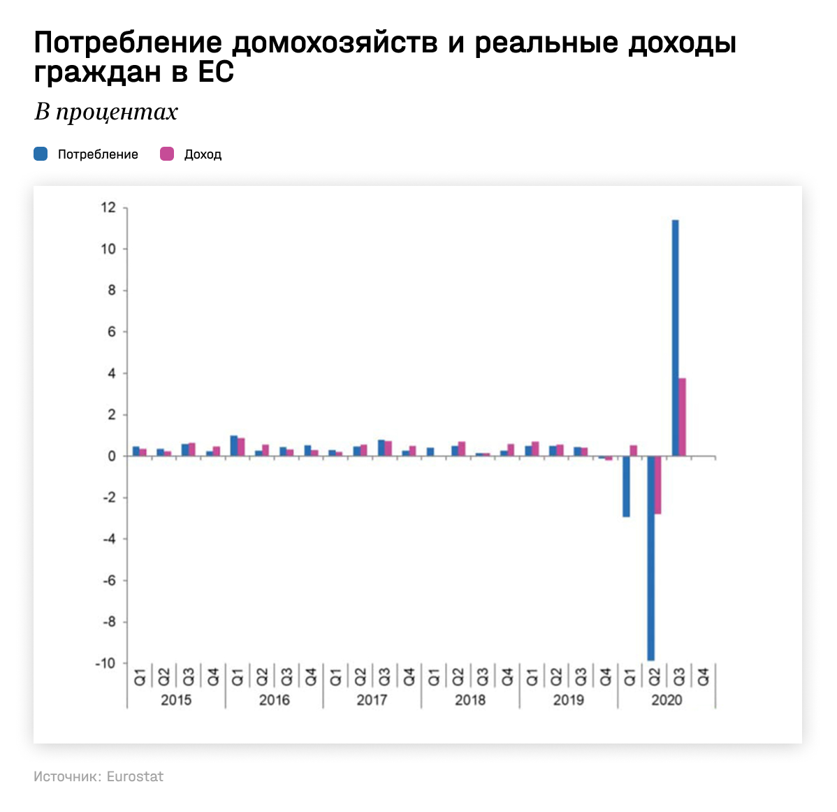 • В Кремле говорят об обратном, но на самом деле реальные располагаемые доходы населения в России в 2020 году упали сильнее, чем во многих странах, — на 3,5%. В еврозоне они выросли на 1,6%, в ЕС в целом — на 1,5%, следует из данных Евростата. Доля людей, которые считают себя финансово пострадавшими из-за COVID, в России за год удвоилась и превысила общемировую.