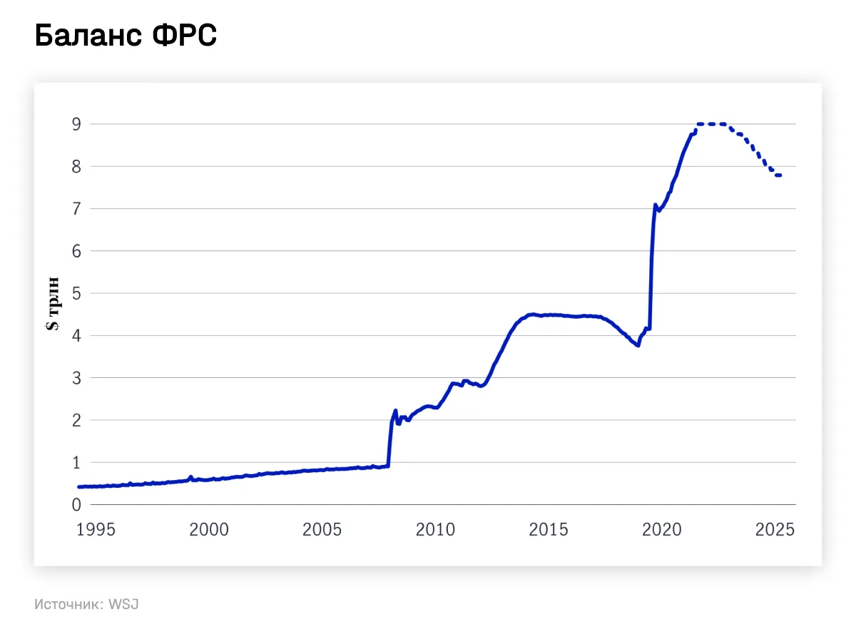 Вероятно, ключевой вопрос для инвесторов в ближайшие несколько месяцев — до какого уровня американский регулятор сможет сокращать свой баланс. К примеру, Джером Шнейдер из Pacific Investment Management считает, что QT в течение нескольких лет уменьшит баланс ФРС до примерно $5 трлн. История показывает, что ФРС может ужесточать денежно-кредитную политику до тех пор, пока что-то «не сломается», приводит Bloomberg слова Кристофера Алвина, главы отдела облигаций в Vanguard Fixed Income Group.