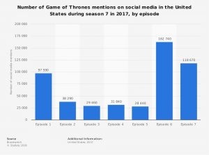- До 160 тысяч доходит количество упоминаний «Игры престолов» и его персонажей в социальных сетях после выхода одной серии сезона, а за полгода сериал так или иначе упомянули в соцсетях больше 20 млн раз.